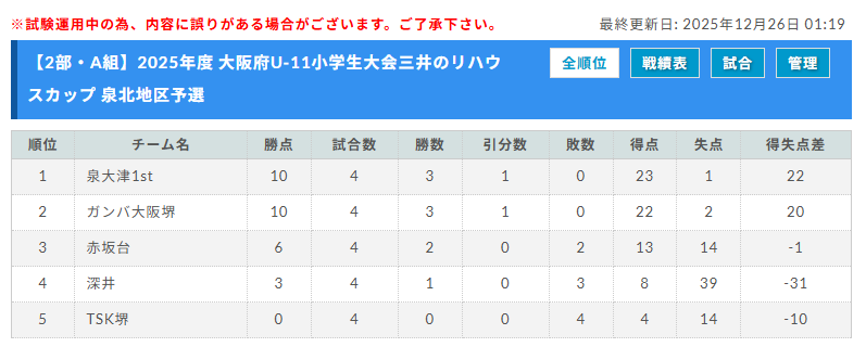 A組 12/21全試合終了 泉大津JFC 1st、ガンバ大阪堺Jrが代表決定トーナメント進出