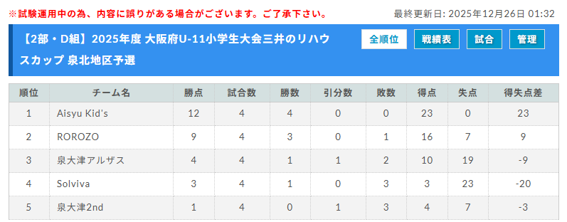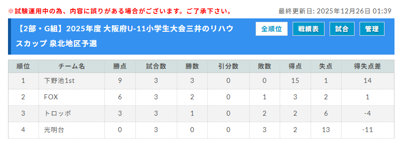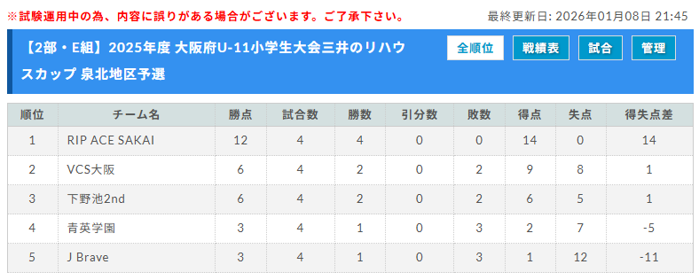 E組 12/27全試合終了 RIP ACE SAKAI、下野池JSS 2ndが代表決定トーナメント進出
