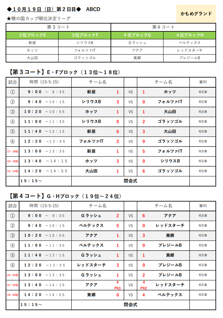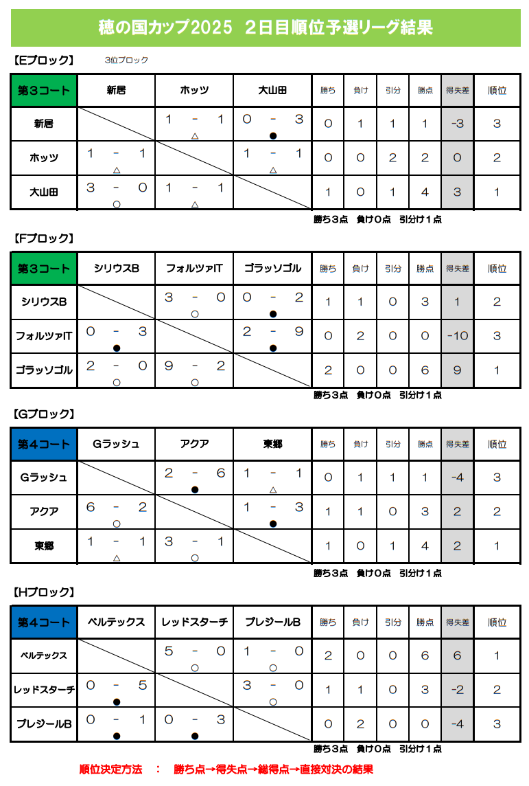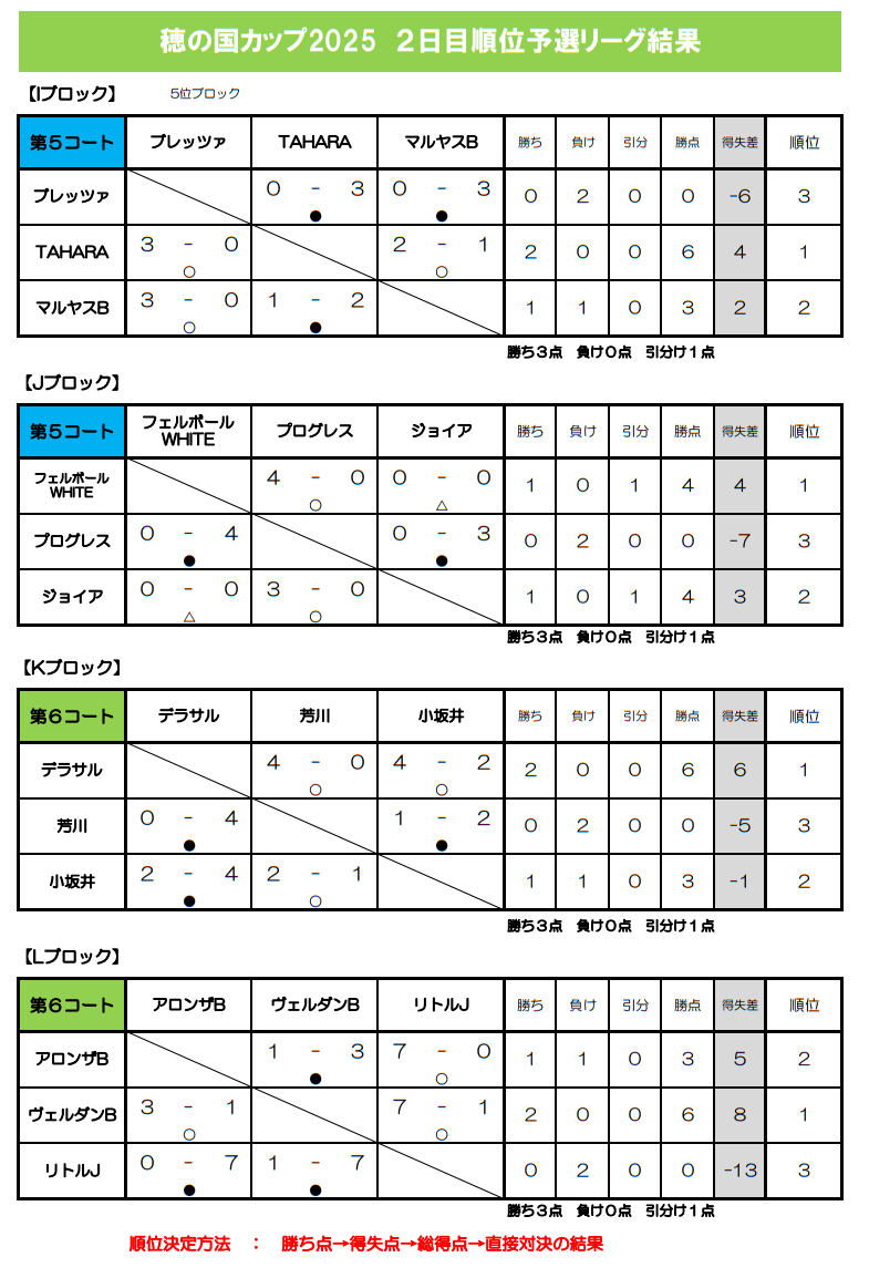 各ブロックリーグ戦、順位決定戦を行う。※1日目のみブロック1番上のチームはTM有り。