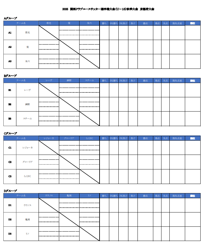 高円宮杯JFA U-15サッカーリーグ2025京都のレギュラーシーズンの順位を反映する。