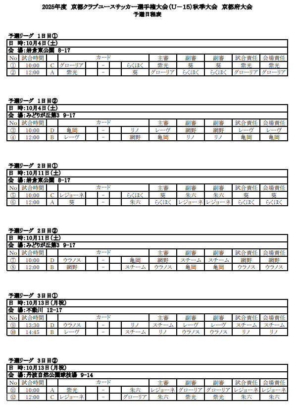 予選リーグ:2025年10月4日(土)、11日(土)、13日(月・祝)