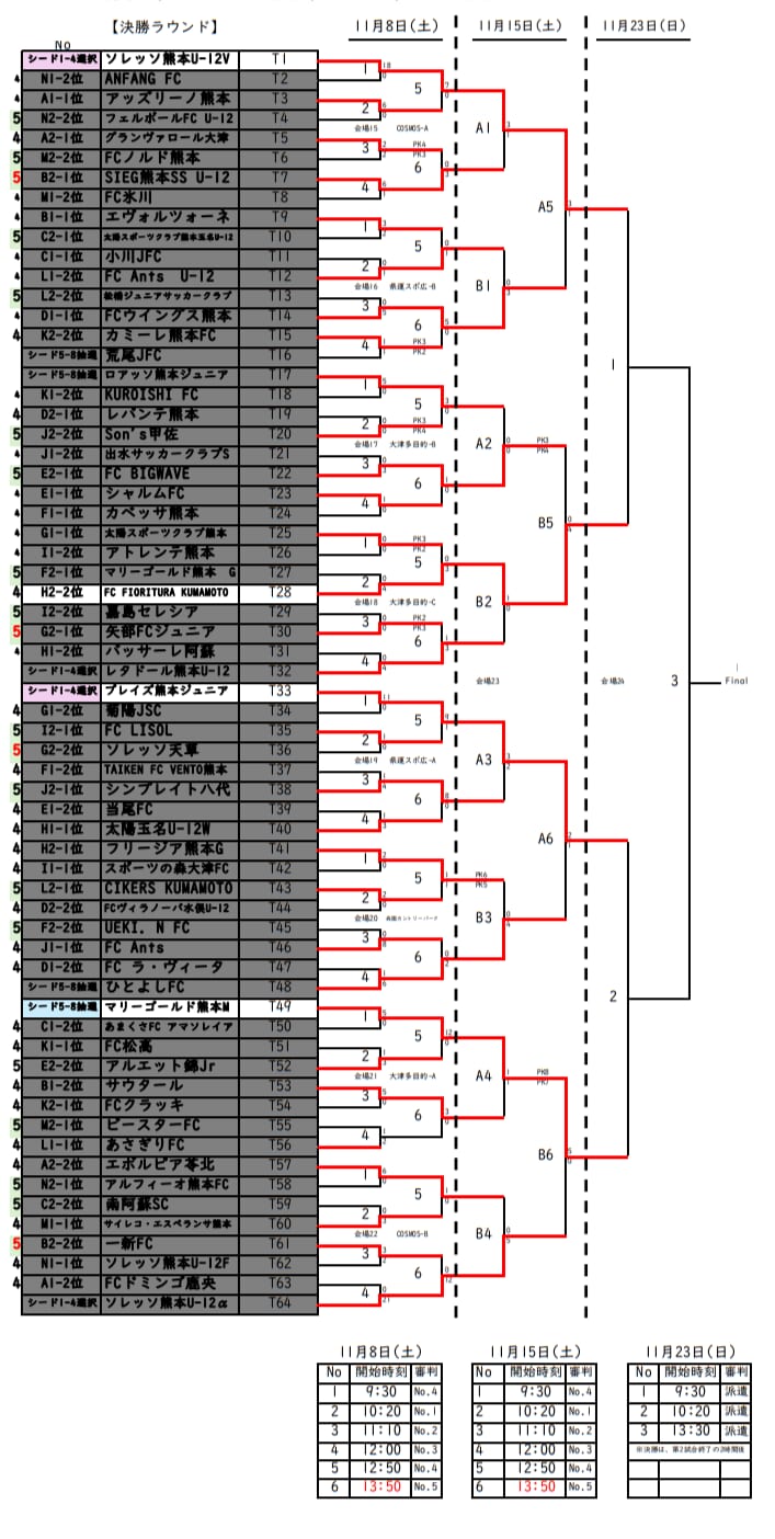 第1シード(ソレッソ熊本 U-12V)、第2シード(ブレイズ熊本ジュニア)、第3シード(ソレッソ熊本 U-12α)、第4シード(レタドール熊本 U-12)第5-8シード(荒尾 JFC/マリーゴールド熊本 M/ひとよし FC/ロアッソ熊本ジュニア)