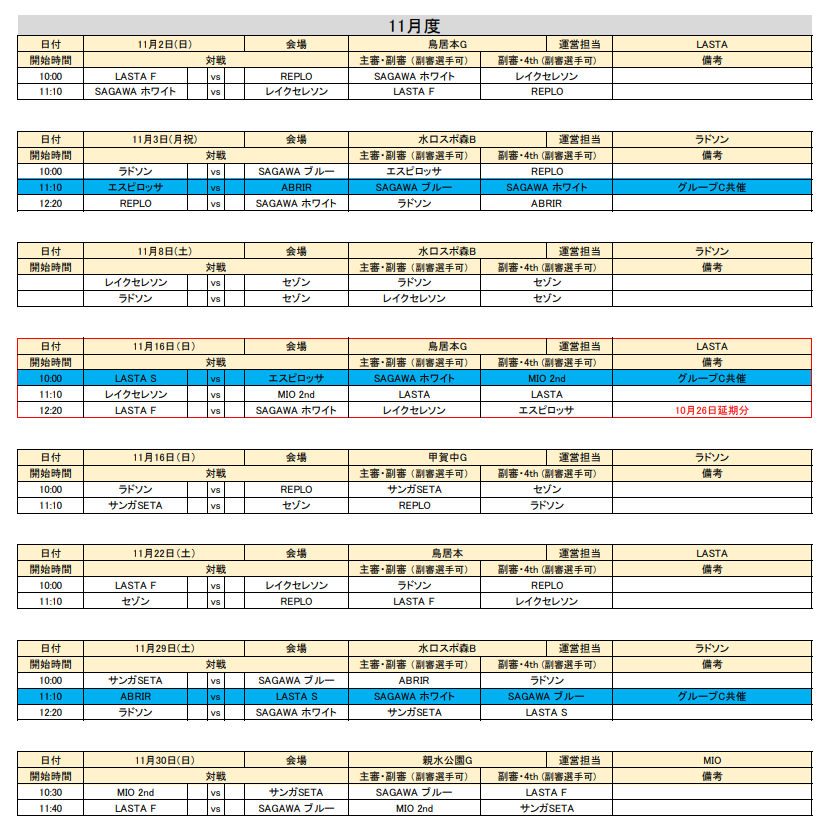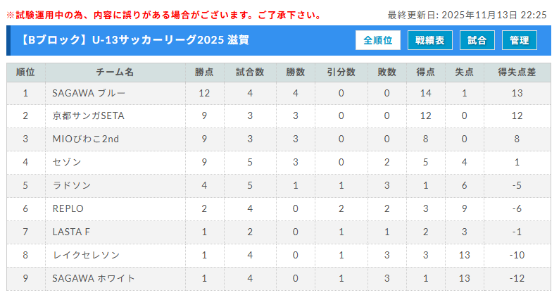 SAGAWA ブルー、京都サンガ U-15 SETA滋賀、MIOびわこ滋賀 U-15 2nd、セゾンFC、ラドソン滋賀、FC REPLO、LASTA 滋賀 F、レイクセレソン、SAGAWA ホワイト