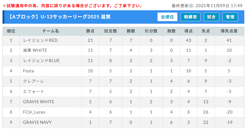 1位:レイジェンド滋賀FC U-15 RED、FC湖東 WHITE、レイジェンド滋賀FC U-15 BLUE、Fosta FC、クレアーレ甲賀、FCエフォート U-15、GRAVIS FC WHITE、FCH_Luces、GRAVIS FC NAVY