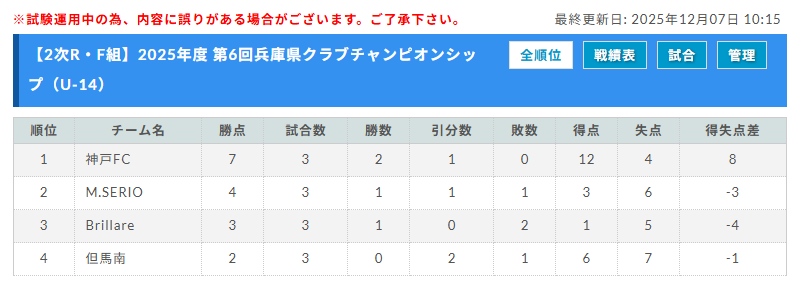 F組 12/6全試合終了 神戸FC、M.SERIOがノックアウトラウンド進出