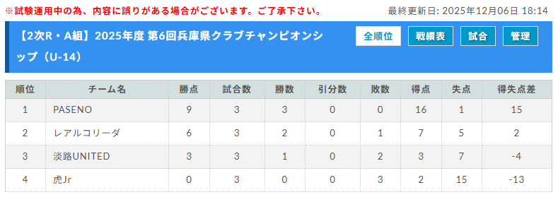 A組 12/6全試合終了 PASENO、レアルコリーダがノックアウトラウンド進出