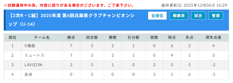 C組 12/6全試合終了 V播磨、ミュートスがノックアウトラウンド進出