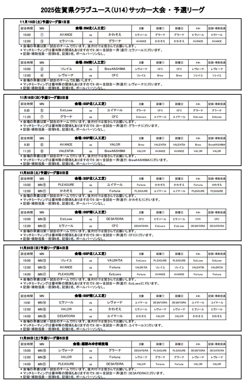 予選リーグ:2025年11月15日(土)、16日(日)、22日(土)、23日(日)、29日(土)
