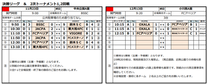 2次トーナメント 11/3→11/8 ,9→11/15,16 B組11/23へ延期