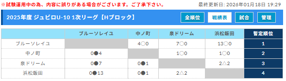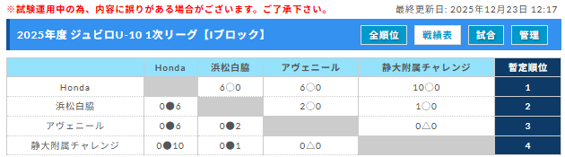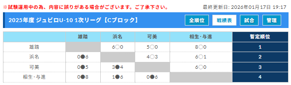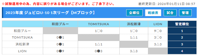 1位:SANTOS、2位:城北、3位:三ケ日、4位:湖西