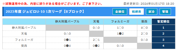 1位:静大附属パープル、2位:フォルミーガ、3位:天竜、4位:葵西