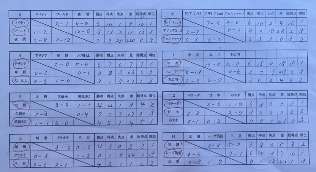 大変失礼いたしました。水田対北野戦と北野対ペラーダ戦のスコアが逆になっていましたので修正しました。