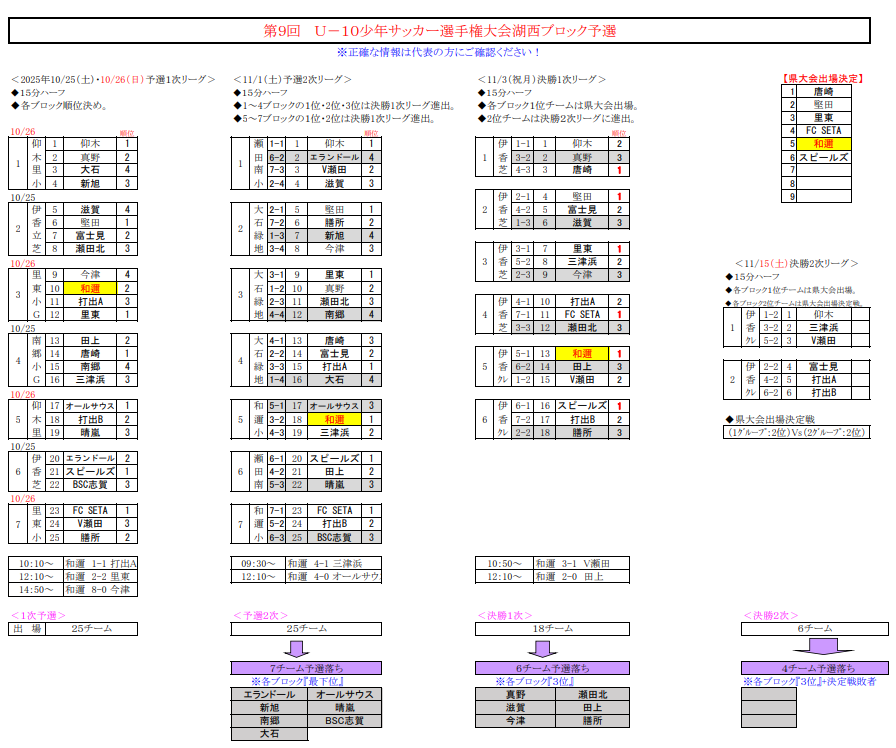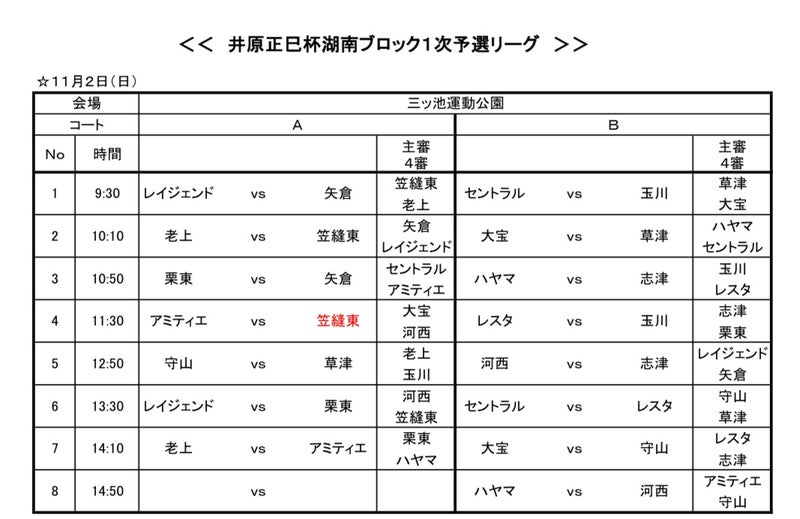 予選2次リーグ 11/8.12/中旬 各ブロック1位が県大会出場決定