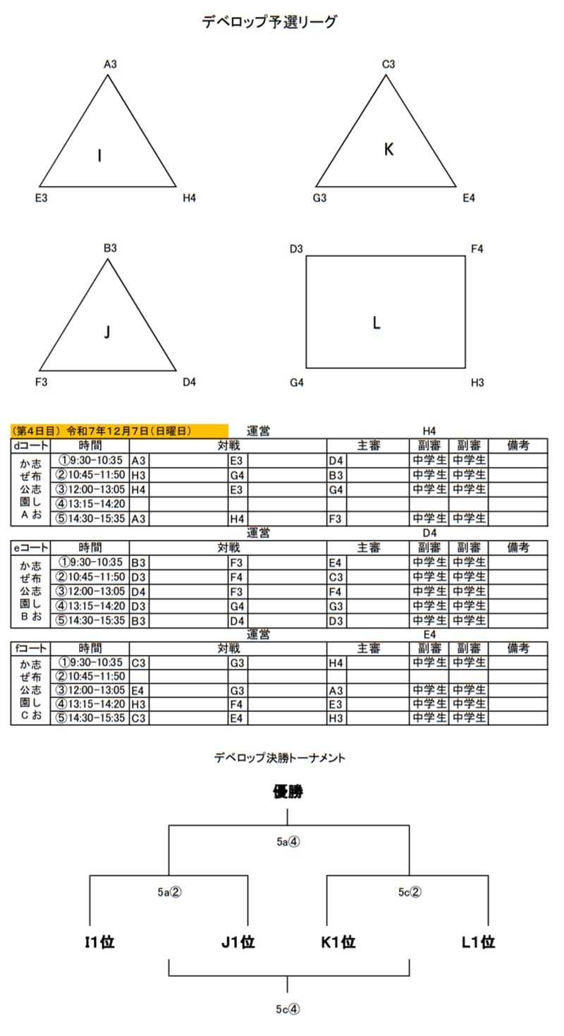 3)試合は予選リーグ戦、順位決定トーナメント戦及びデベロップ戦とする。