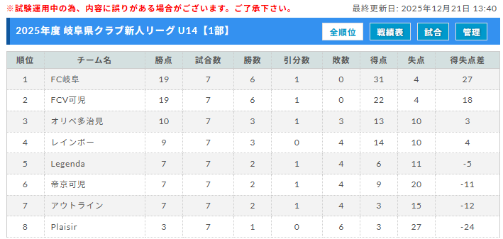 2024年度 岐阜県クラブ新人リーグ U14 優勝はFC岐阜!12/22まで結果更新中 引き続き未判明結果/順位募集