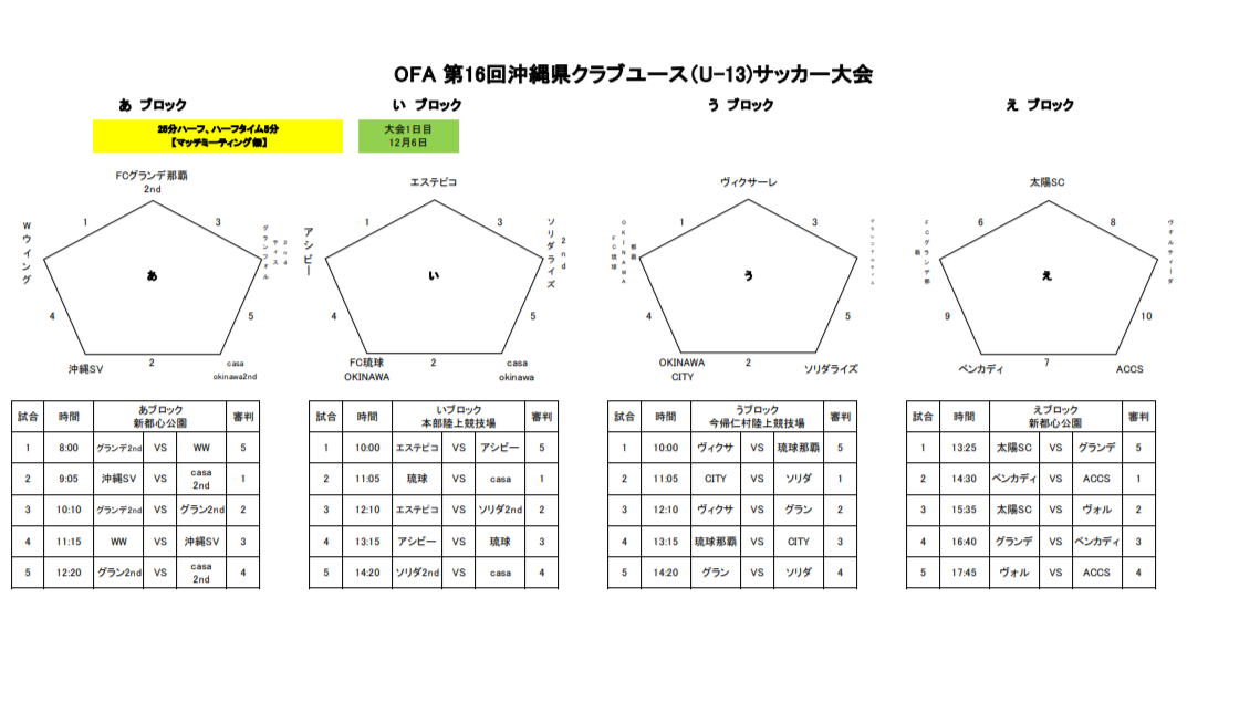FC GRANDE那覇2nd、Wウイング沖縄、沖縄SV U-15、casa okinawa 2nd、グランフォルティス 2nd