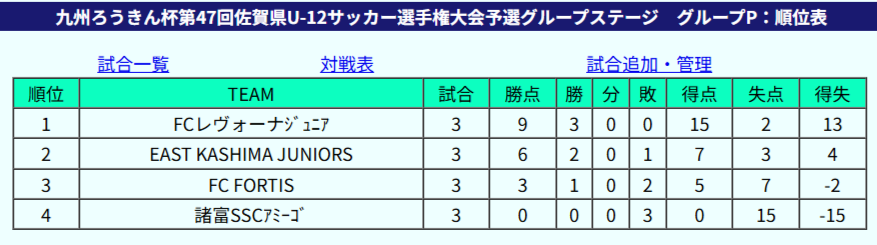 1位:FCレヴォーナジュニア、2位:EAST KASHIMA JUNIORS、3位:FC FORTIS、4位:諸富SSCアミーゴ