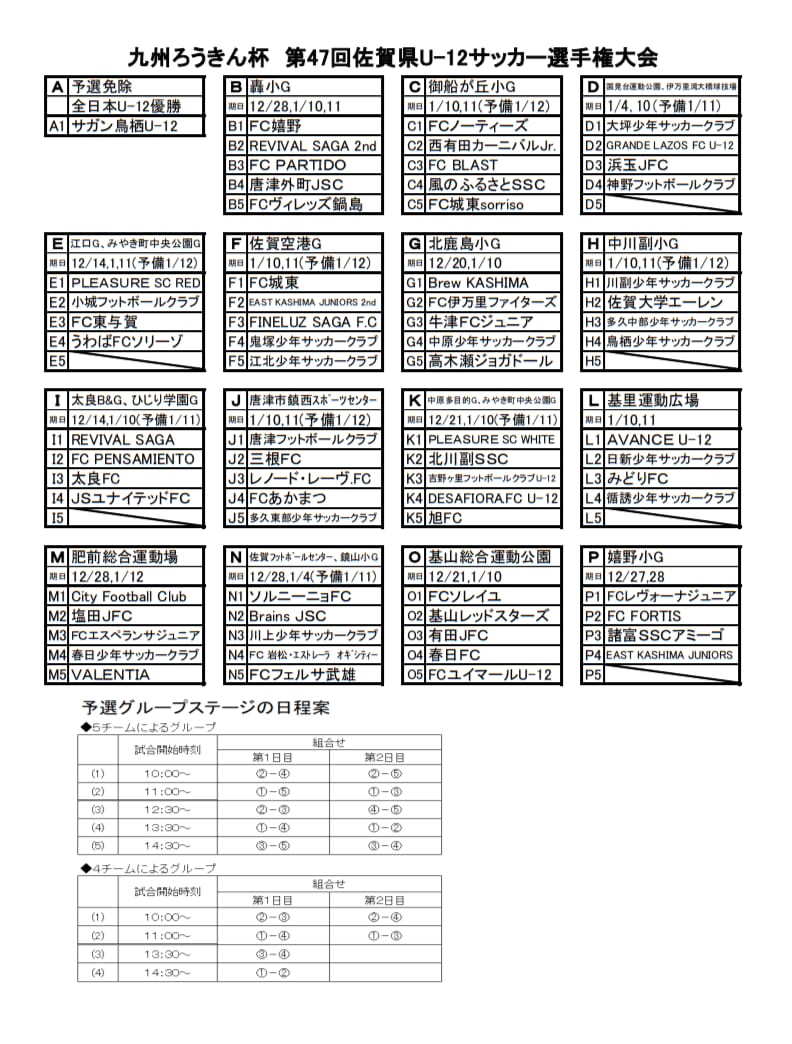 ステージ参加全チームのうち、全日本U-12サッカー大会全国大会出場チーム以外のチームを15パートに分けて予選グループステージを行う。全日本U-12サッカー大会佐賀県大会ベスト16のチームを組合せ時にシードする。シードチームは、各パートの試合運営の責任者となる。