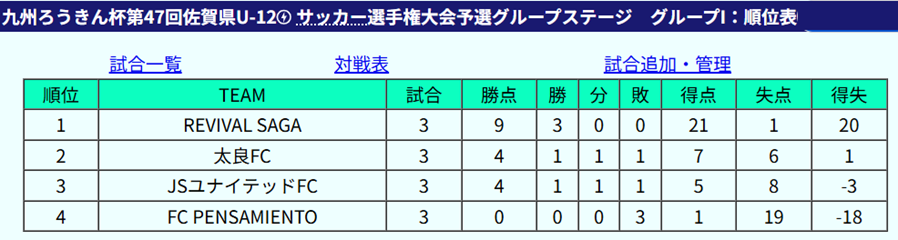 1位:REVIVAL SAGA、2位:太良FC、3位:JSユナイテッドFC、4位:FC PENSAMIENTO