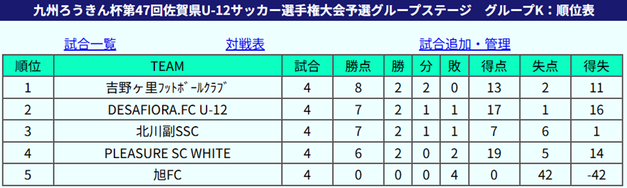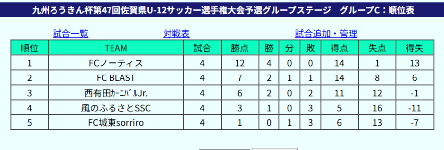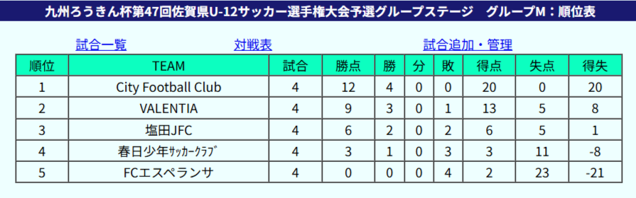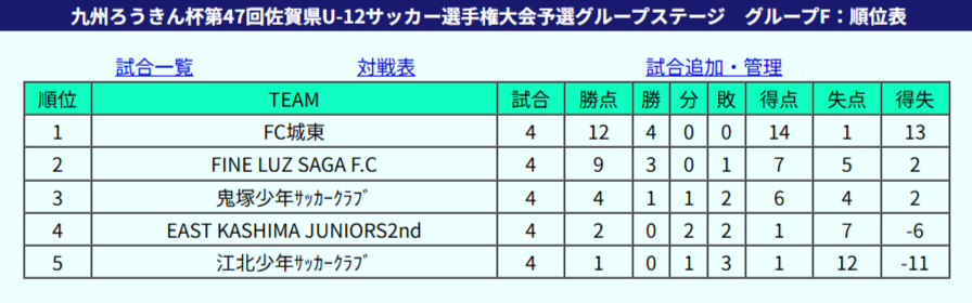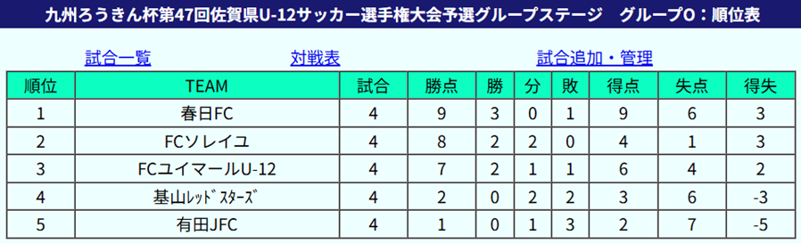 1位:春日FC、2位:FCソレイユ、3位:FCユイマールU-12、4位:基山レッドスターズ、5位:有田JFC