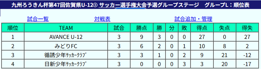1位:AVANCE U-12、2位:みどりFC、3位:循誘少年サッカークラブ、4位:日新少年サッカークラブ