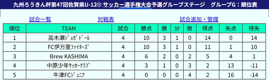 1位:高木瀬ジョガドール、2位:FC伊万里ファイターズ、3位:Brew KASHIMA、4位:中原少年サッカークラブ、5位:牛津FCジュニア