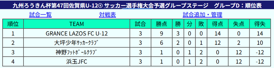 1位:GRANDE LAZOS FC U-12、2位:大坪少年サッカークラブ、3位: 神野フットボールクラブ、4位:浜玉JFC