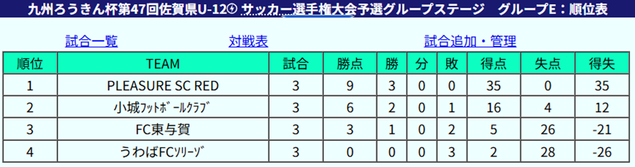 1位:PLEASURE SC RED、2位:小城フットボールクラブ、3位:FC東与賀、4位:うわばFCソリーゾ