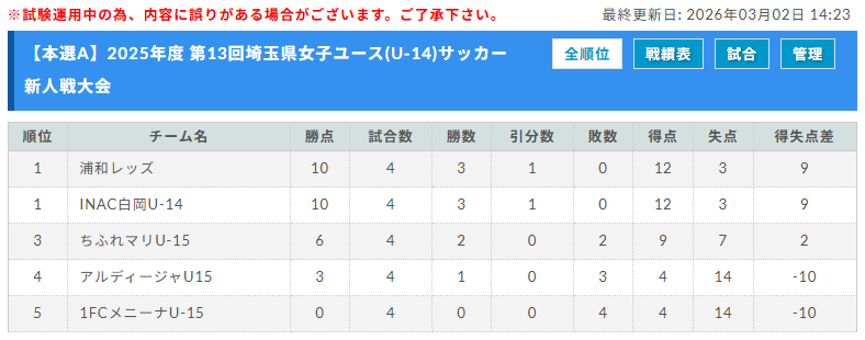 2024年度 第12回埼玉県女子ユース(U-14)サッカー新人戦大会 優勝は浦和レッズレディース!2/24未判明結果募集中