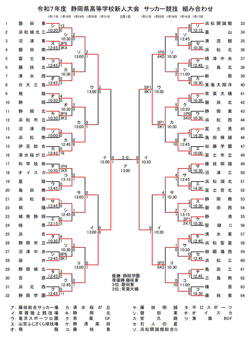 静岡高校サッカー新人戦、組み合わせ、会場決定版を添付します。
