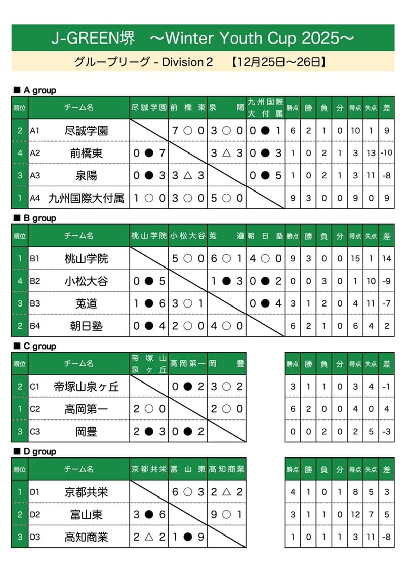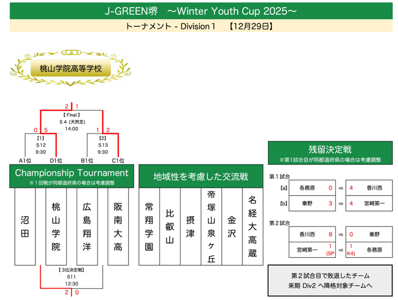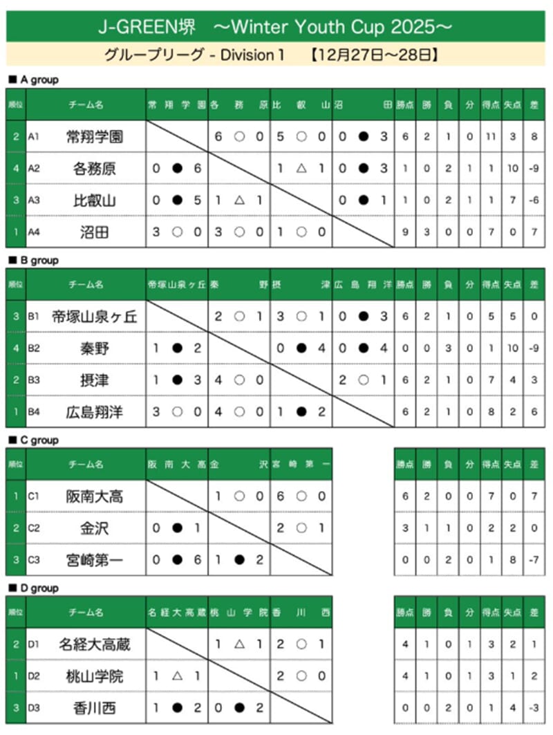 J-GREEN SAKAI Winter Youth Cup 2024(大阪) Division1優勝は常翔学園高校!全結果掲載