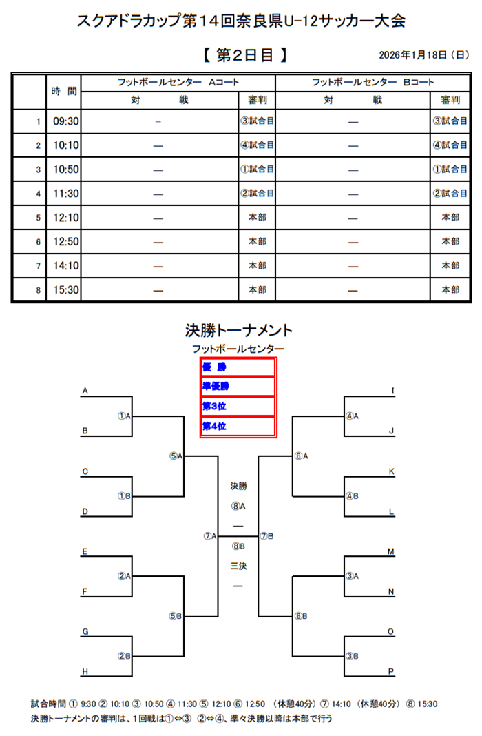 ・プレーの時間は、 30分 (前後半各15分ハーフタイム5分) で行い、決勝トーナメントにおいて勝敗の決しない場合は準決勝までは3名によるペナルティーキック方式により次戦へ進出するチームを決定する。