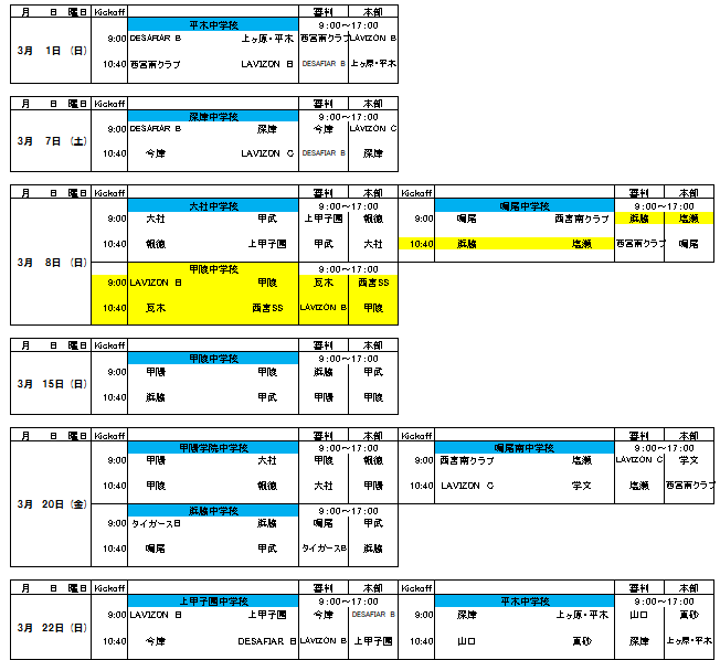 LAVIZON B、西宮タイガースB、鳴尾、甲陽学院、大社、浜脇、上甲子園、甲陵、西宮南、報徳学園、甲武、塩瀬