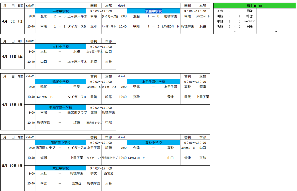 LAVIZON B、甲陽学院、浜脇、西宮タイガースB、鳴尾、大社、報徳学園、甲陵、上甲子園、甲武、西宮南、塩瀬