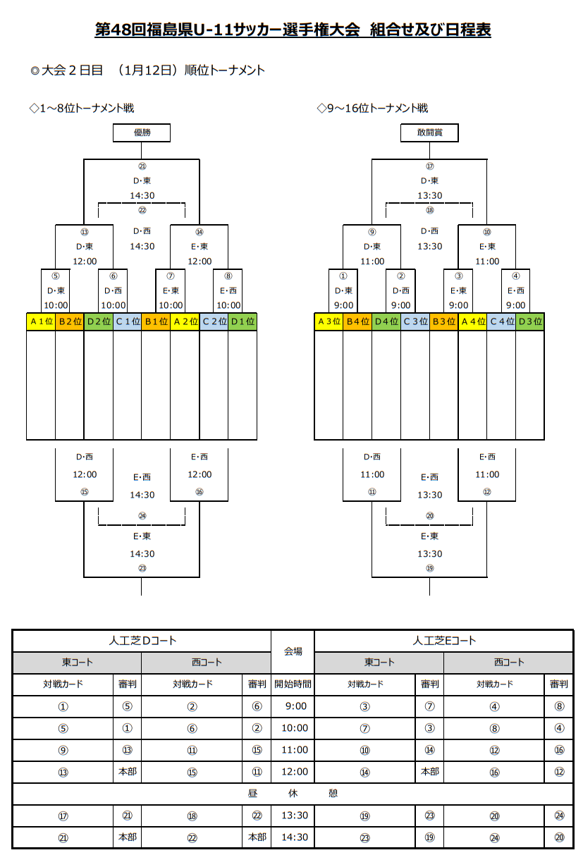 (2)予選リーグ(16チームを4グループに分け)を行い、グループ上位2チームが上位トーナメン
