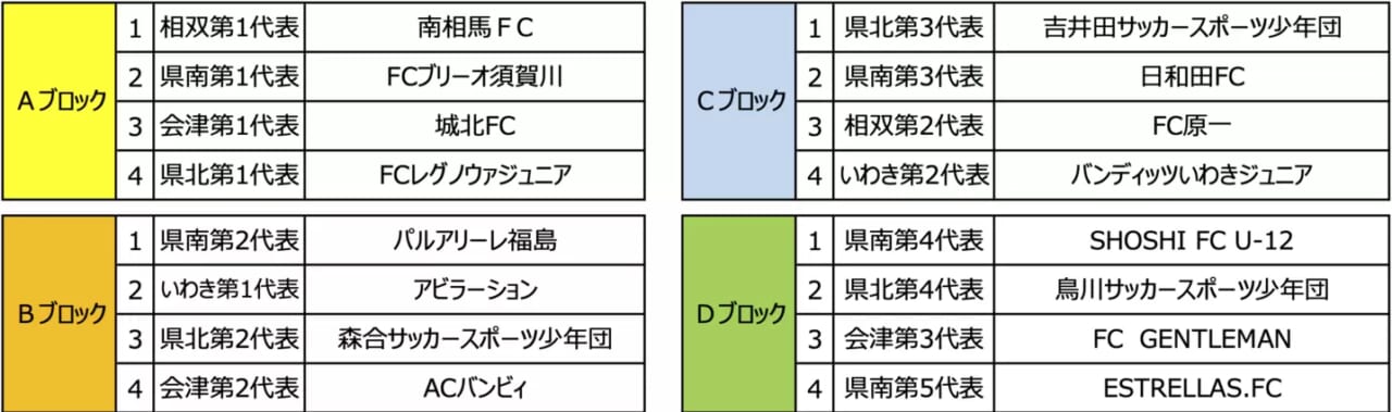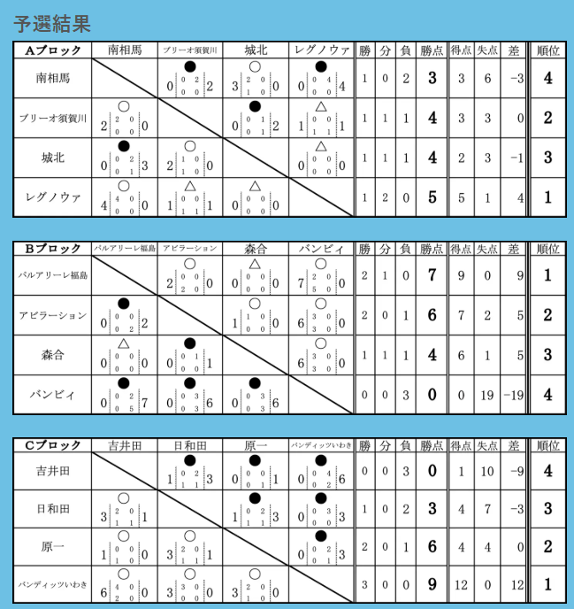 Aブロック:1位 FCレグノウァジュニア、2位 FCブリーオ須賀川、3位 城北FC、4位 南相馬FC