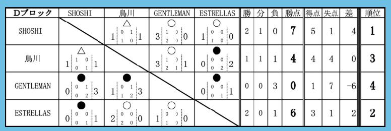 Dブロック:1位 SHOSHI FC U-12、2位 ESTRELLAS.FC、3位 鳥川SSS、4位 FC GENTLEMAN、