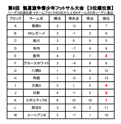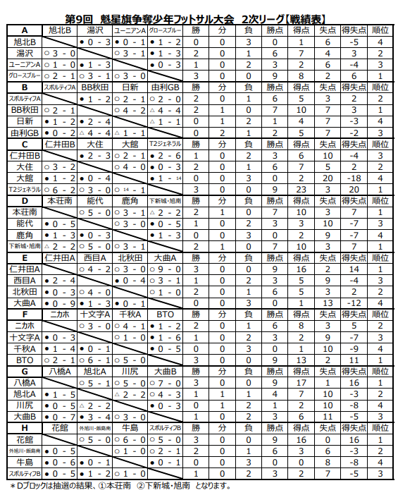 K:1位 仁井田B、 2位 西目A 、3位 スポルティフB、4位 御所野