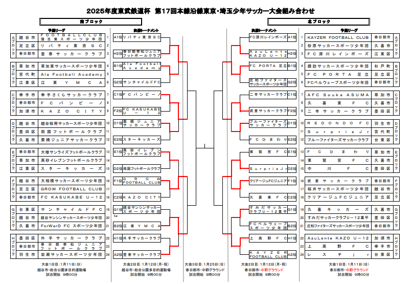 2025年度 第17回東武鉄道杯 本線沿線・東京埼玉少年サッカー大会 1/12までの結果掲載!準々決勝~決勝は1/25