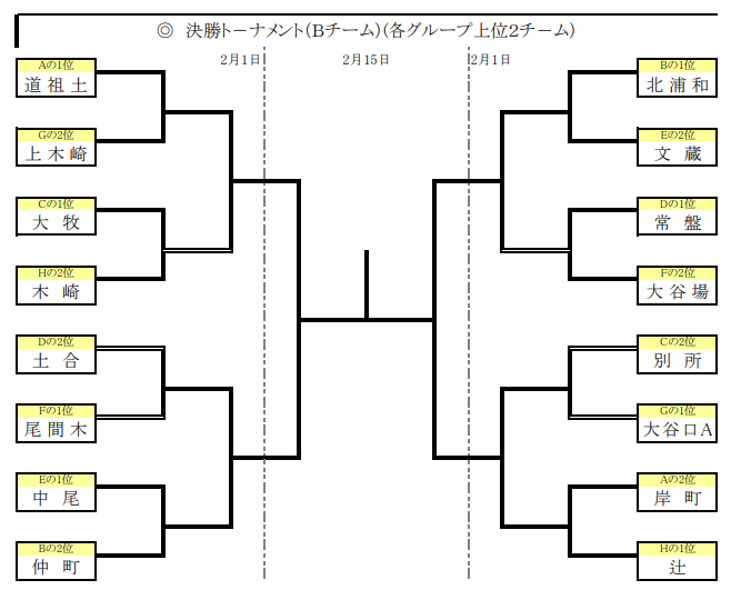 ・決勝トーナメント:Bチームは、各ブロック上位2チームで開催する。