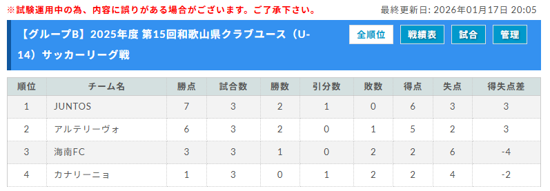 2025年度 第15回和歌山県クラブユース(U-14)サッカーリーグ戦 1/17結果更新!次戦1/31