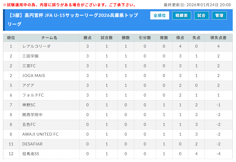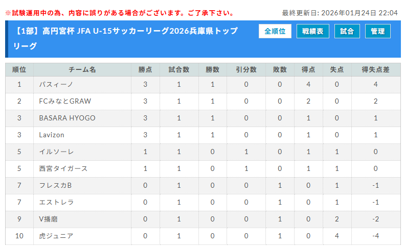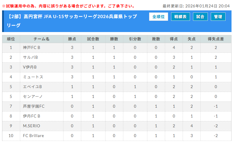 ・2024兵庫県トップリーグ(U-15)総合順位の上位チームから1部へ昇格または繰り上げ残留となる。