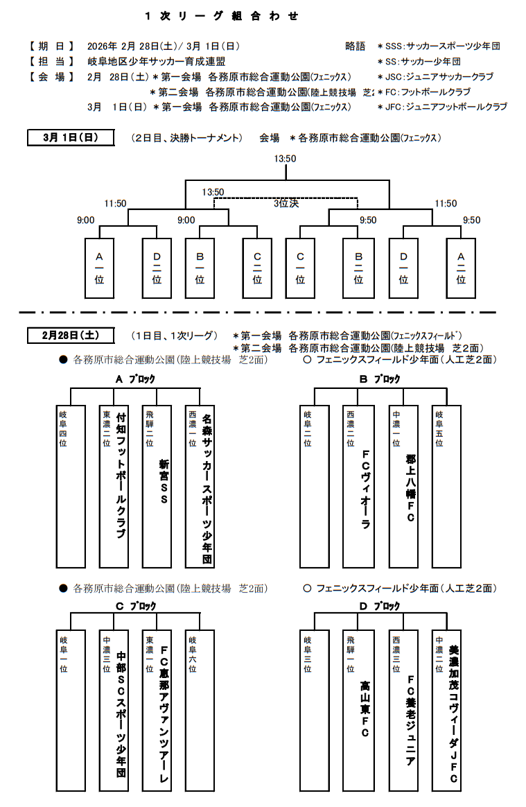 __(岐阜3位)、高山東SSS(飛騨1位)、FC養老ジュニア(西濃3位)、美濃加茂コヴィーダJFC(中濃2位)