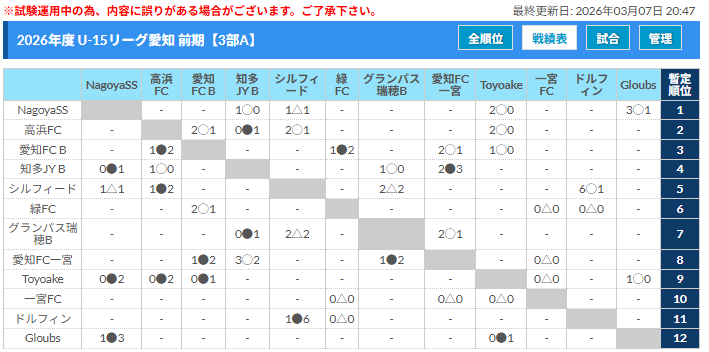 シルフィードFC、高浜FC、Nagoya S.S.、FC.Toyoake、緑FC、愛知FC一宮、Gloubs FC、ドルフィンFC、一宮FC、知多JY B、愛知FC B、名古屋グランパス瑞穂B