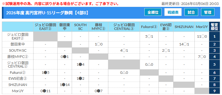 ジュビロ磐田CENTRALセカンド、SHIZUNAN FC、ジュビロ磐田EASTセカンド、磐田東中、 MoriJY・FC、藤枝MYFCセカンド、EWS初倉FCセカンド、SOUTH SC、Fukuroi FC セカンド