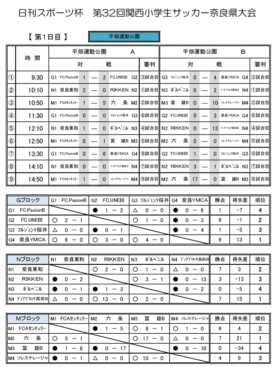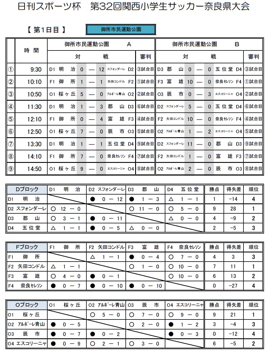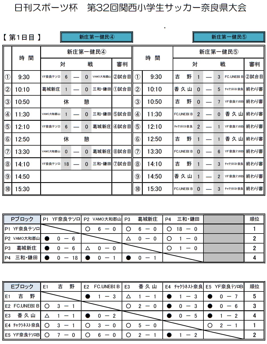 1位:YF奈良テソロ、2位:VAMO奈良郡山、2位:新庄、3位:三和・鎌田