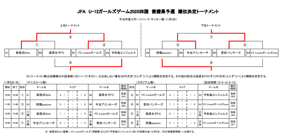 4.勝敗の決しない場合、予選リーグは引き分けとする。決勝トーナメントは、PK 方式(3人ずつ)により勝敗を決定する。ただし、決勝戦、三位決定戦のみ6分(3分ハーフ)の延長戦を行い、なお決しない場合はPK方式(3人ずつ)により