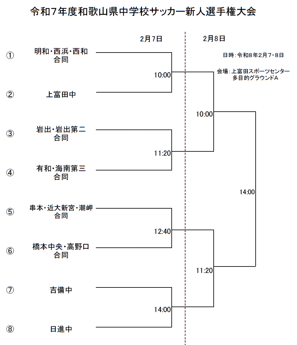 - 和歌山市、紀北、中紀、紀南それぞれのブロック予選を勝ち抜いた代表2チーム、計8チームによるトーナメント戦を行う。