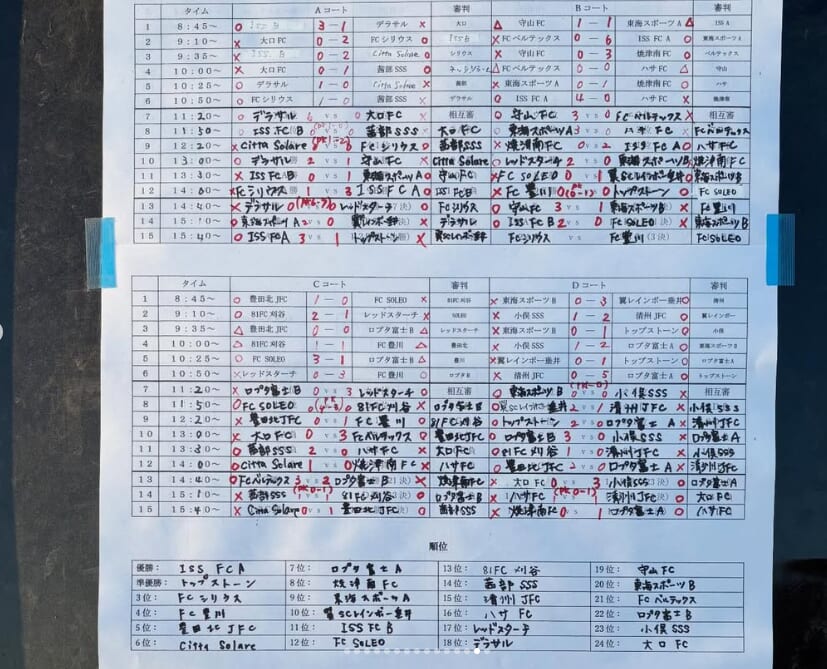4位:FC豊川 5位:豊田北JFC 6位:Citta Solare 7位:ロプタ富士A 8位:焼津南FC 9位:東海スポーツA 10位:翼SCレインボー垂井 11位:ISS FC B 12位:FC SOLEO 13位:81FC刈谷 14位:茜部SSS 15位:清州JFC 16位:ハサFC 17位:レッドスターチ 18位:デラサル 19位:守山FC 20位:東海スポーツB 21位:FCベルテックス 22位:ロプタ富士B 23位:小俣SSS 24位:大口FC