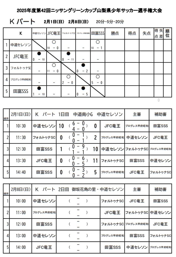 中道セレソン、JFC竜王、フォルトゥナSC、プログレス甲府昭和、田富SSS
